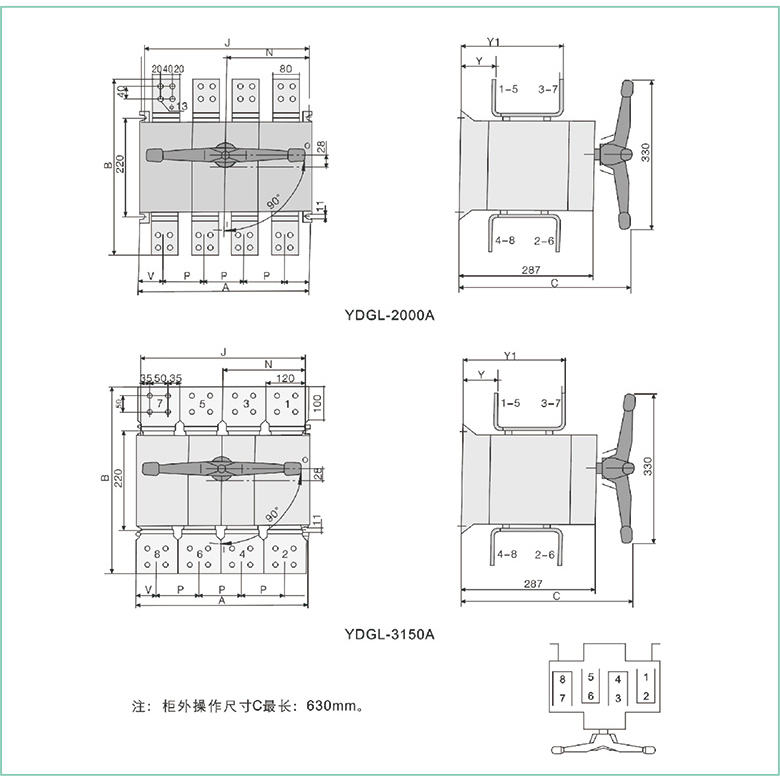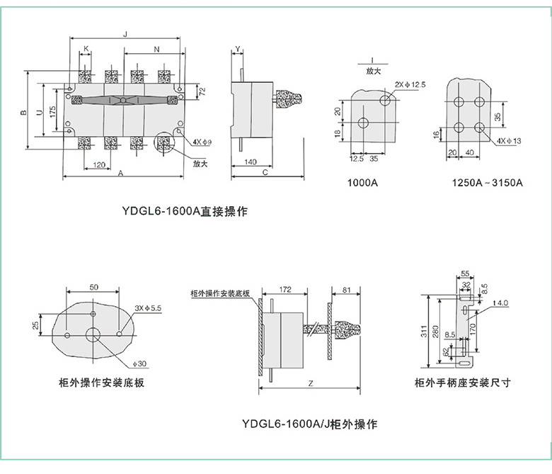 ·YDGL柜内操作及YDGL柜外负荷隔离开关安装尺寸